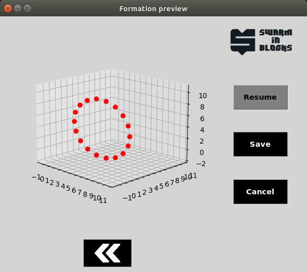 - Swarm Preview: The main goal of this feature is to help the user to visualize how the swarm will behave in the simulation or real life, without using a lot of computational power and avoiding some problems in the simulation. This way a 2D or 3D image illustrating the drones' disposition can pop up on the screen when using this function.