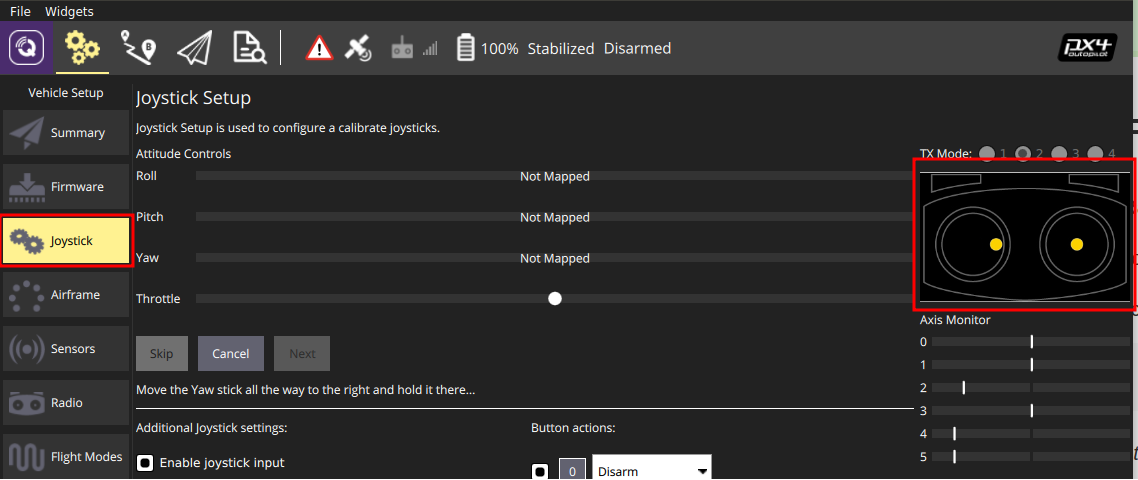 Если изменения положения стиков отображается в окне QGroundControl, вам остается только применить параметр, определяющий, что управление коптером происходит с помощью джойстика, а не радиоаппаратуры: