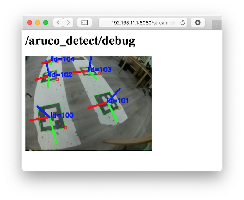 Наглядно распознанные маркеры можно видеть в топике aruco_detect/debug. Просмотреть его можно с помощью rqt_image_view или через web_video_server по ссылке http://192.168.11.1:8080/snapshot?topic=/aruco_pose/debug: