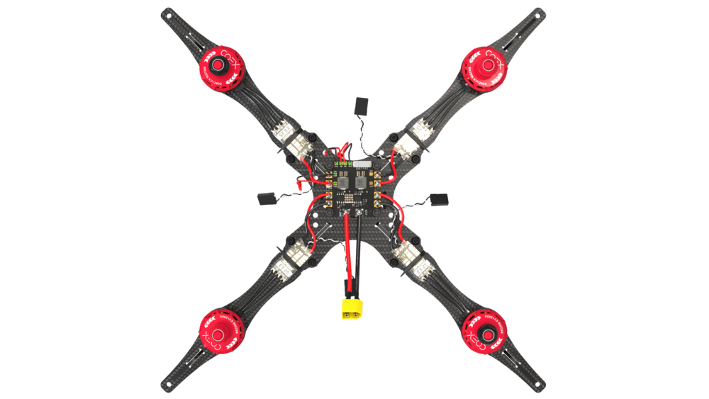 На заранее закрепленные стойки установите плату распределения питания (PDB), она должна быть установлена таким образом, чтобы силовой кабель питания был направлен в сторону хвоста коптера.