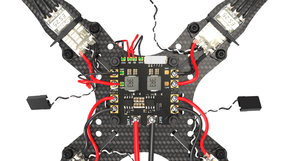 Припаяйте силовые провода регуляторов оборотов к плате распределения питания.