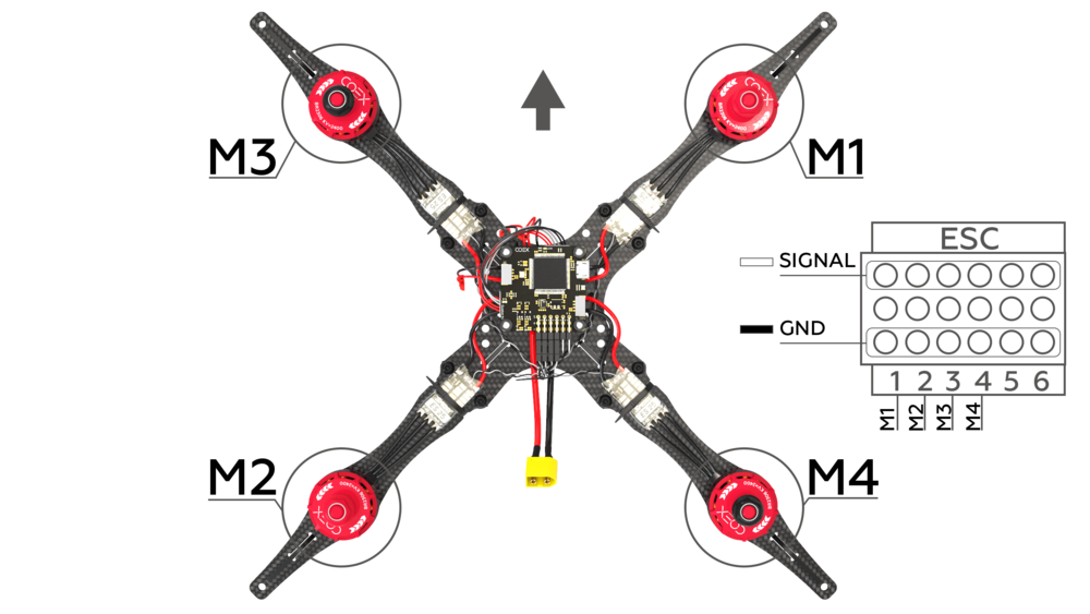 Подключите регуляторы оборотов к полетному контроллеру в соответствии со схемой.