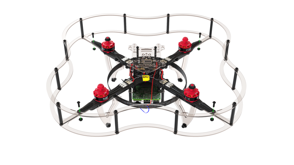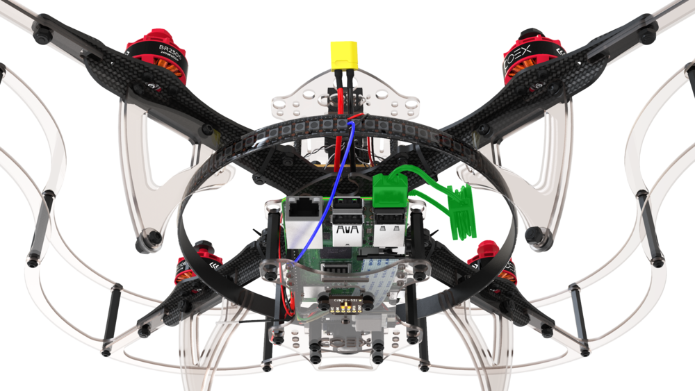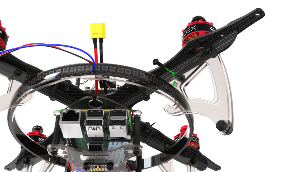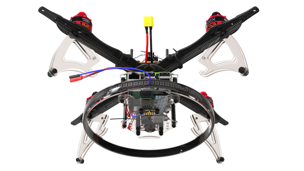 Отогните ножки назад и в специальный паз на них установите обруч со светодиодной лентой, таким образом, чтобы кабели подключения выходили с хвостовой стороны коптера.