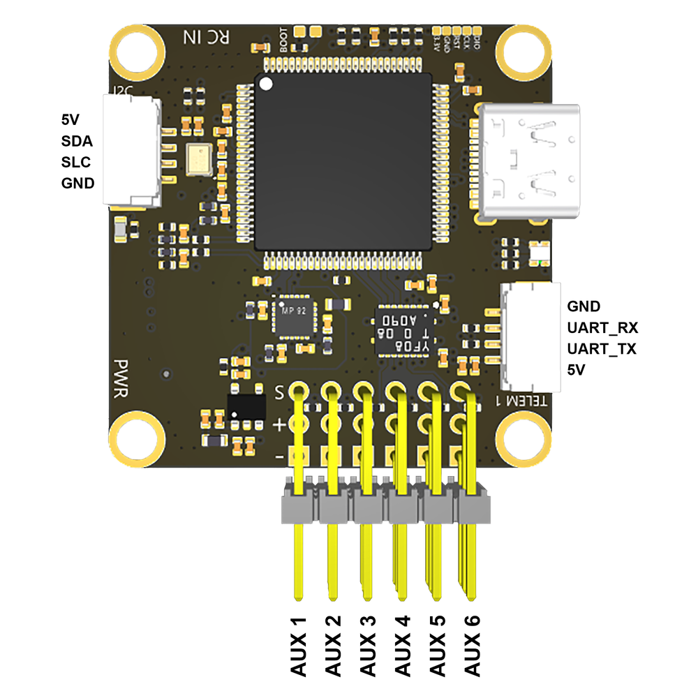 - PWR (JST-GH 6 pin) – разъем для подключения питания с платы COEX PDB или аналогичной, датчиков напряжения и тока.