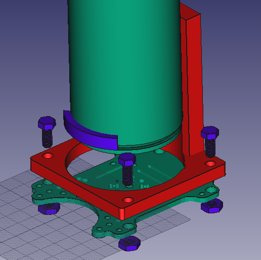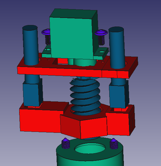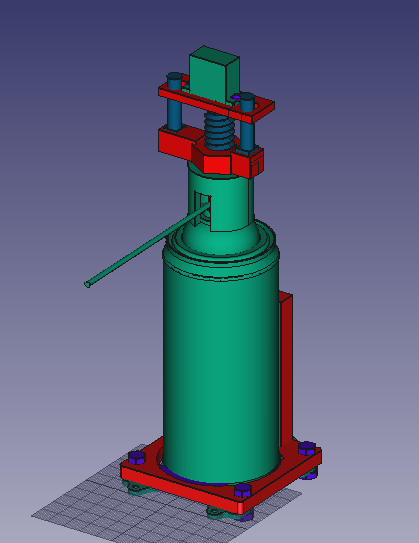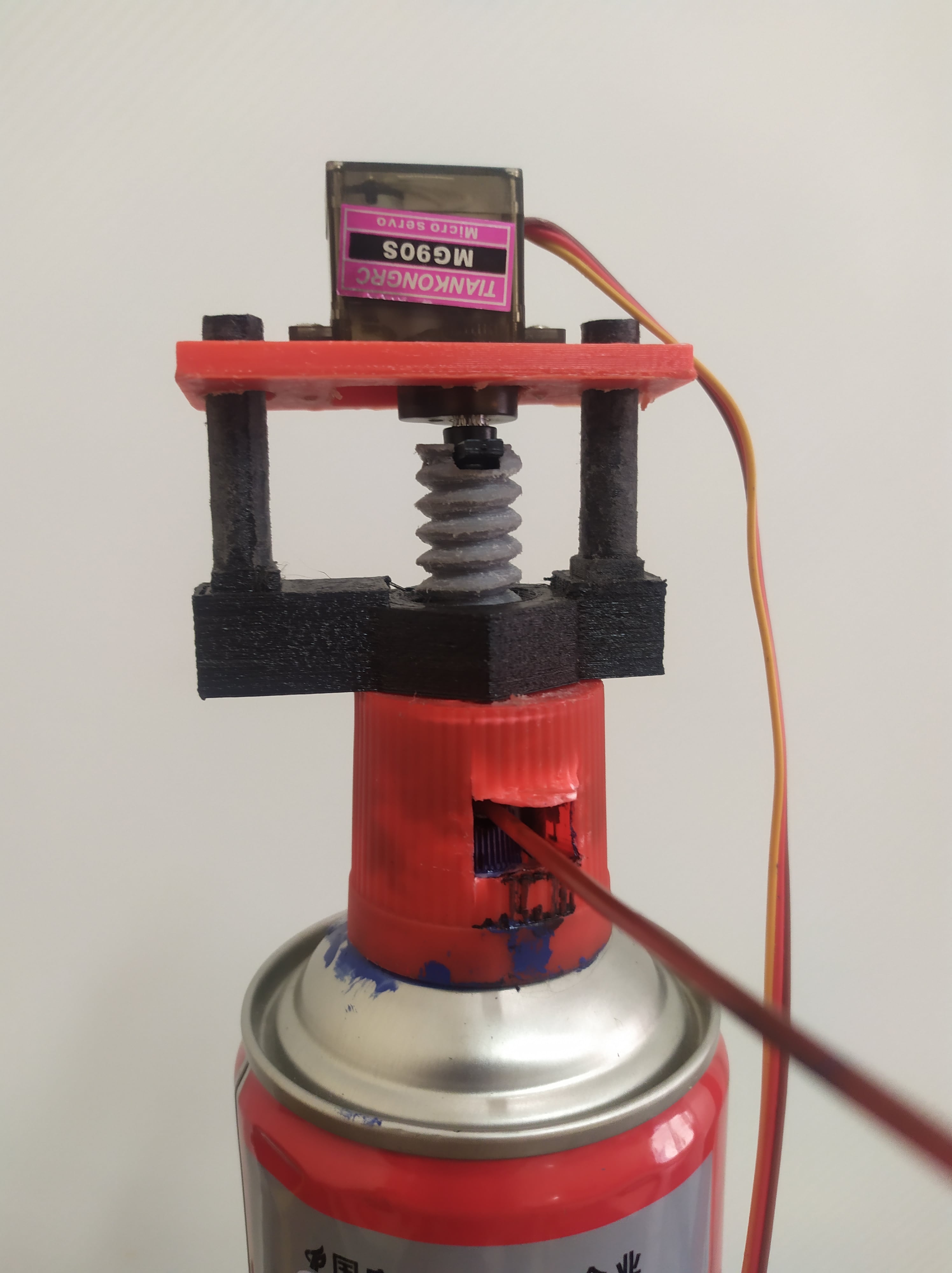 Схема нажатия. Для нажатия клапана будем использовать винтовую передачу с неподвижной гайкой. К сервоприводу будут прикреплена планка с отверстиями, в которых будут входить стойки, закрепленные к гайке. Это помогает сервоприводу двигаться только по одной оси, вверх вниз. Также мы смоделировали крышку для кнопки баллончика, так как поверхность насадки не ровная.
