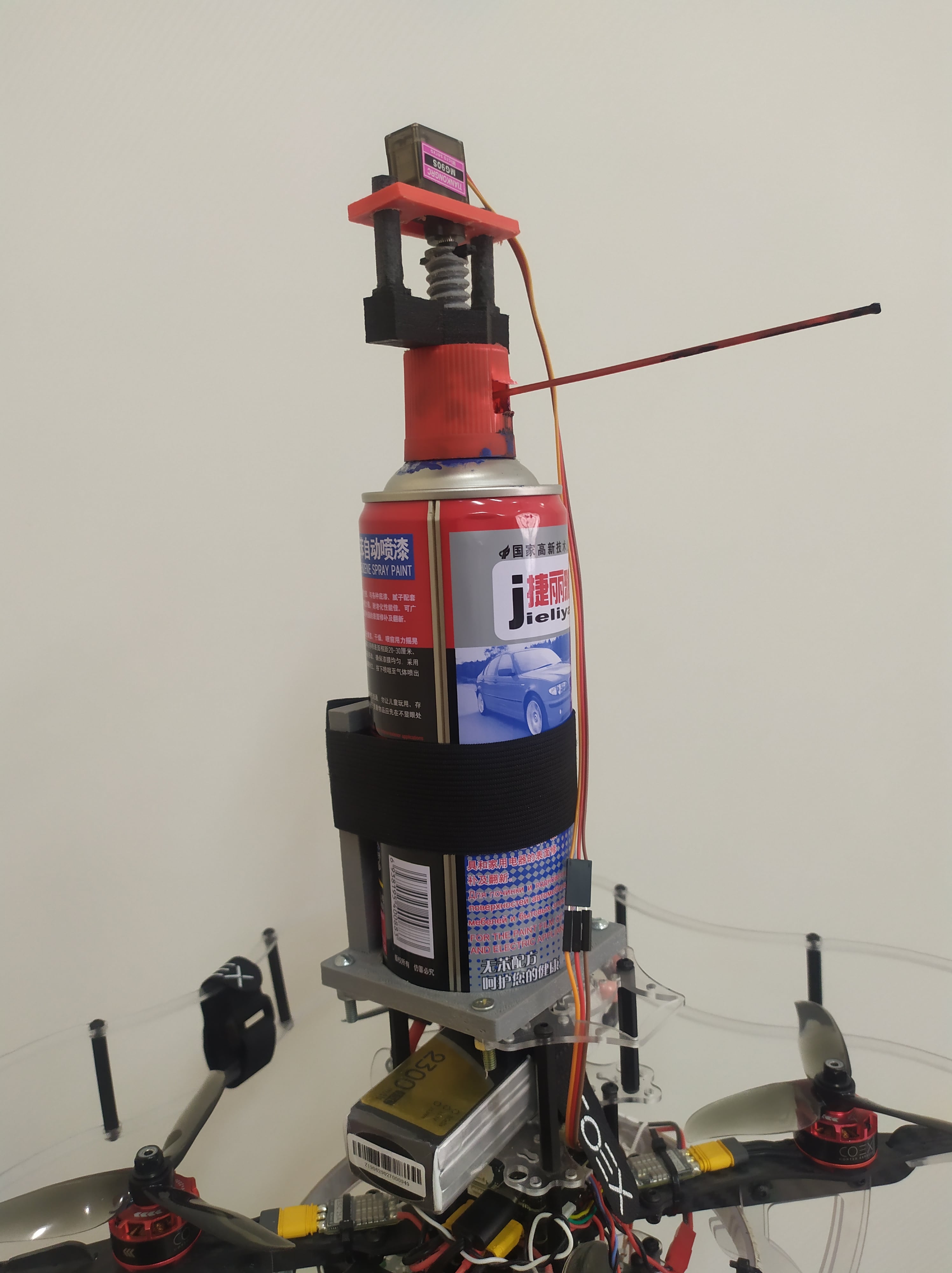 Держатель баллончика. Держатель баллончика прикрепляется к деке 4 винтами и гайками. Чтобы закрепить баллончик к держателю мы использовали ленту с липучкой. С помощью 4 гаек и винтов закрепляем деку с держателем сверху дрона.