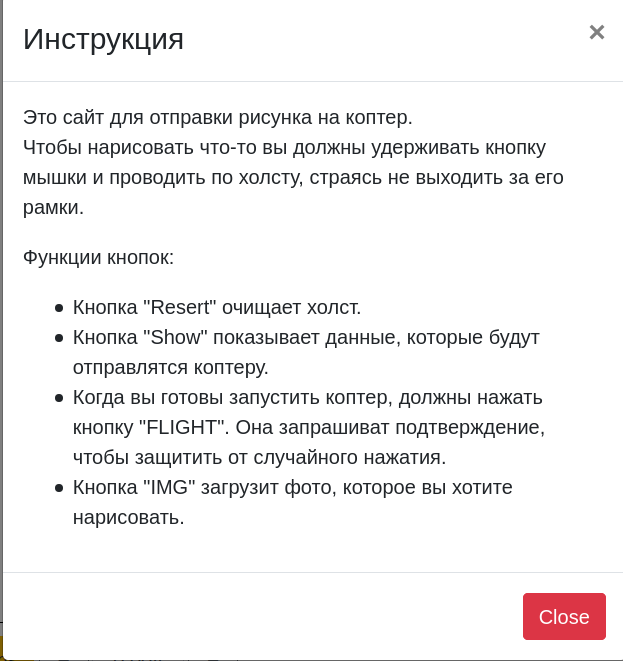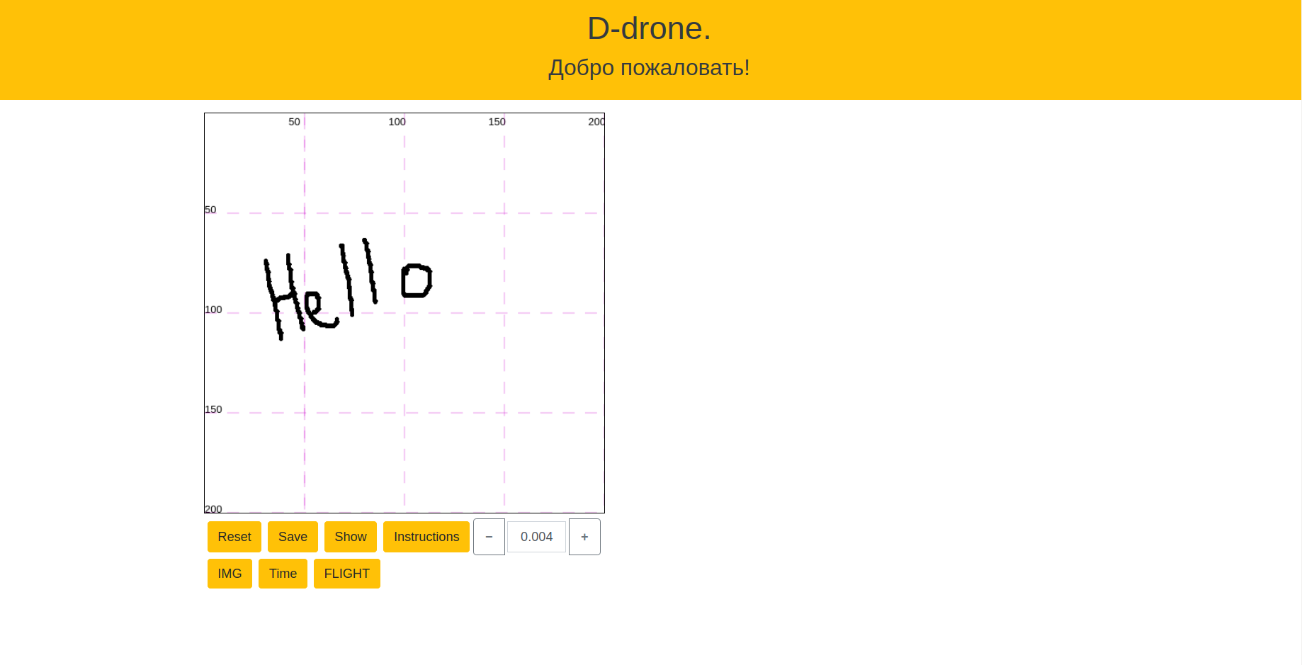 Запуск нашего дрона осуществляется с помощью веб-сайта. Веб-интерфейс позволяет рисовать и кодировать нарисованное в G-code. Данные координат будут переданы для дальнейшей обработки и исполнением коптером.