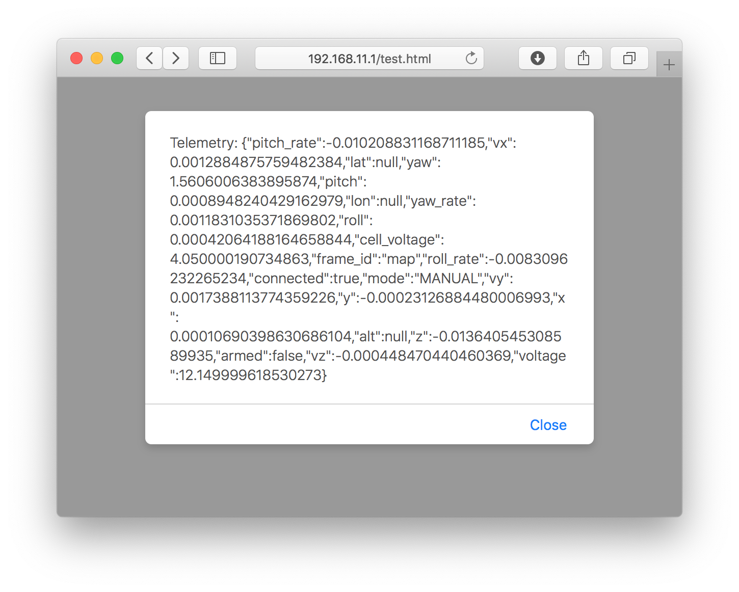Страница должна быть помещена в каталог /home/pi/catkin_ws/src/clover/clover/www/. После этого она станет доступна по адресу http://192.168.11.1/clover/<имя_страницы>.html. При открытии страницы браузер должен показать окно с телеметрией дрона, а также постоянно выводить состояние полетного контроллера в консоль.