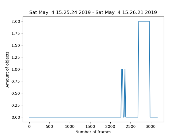 Итогом работы программы будет записанное видео с метками, отмечающими распознавание объектов и их номер, а также .png изображение, на котором показана информация о времени записи видео, количестве распознанных объектов в разное время.