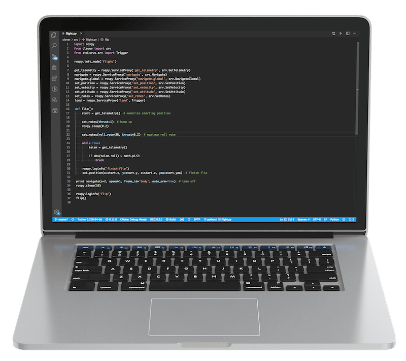 Платформа Клевера позволяет использовать Raspberry Pi для того, чтобы запрограммировать автономный полет дрона. Чаще всего программа для автономного полета пишется на языке Python. Программа может получать телеметрию (заряд батареи, ориентацию, положение, скорости) и отправлять команды, например: полететь в точку, установить ориентацию, установить угловую скорость.